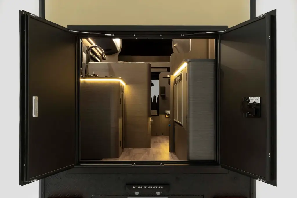 KATANAは後方に観音開きのダブルドアを採用している。大きく開く構造は荷物の積み下ろしを容易にするだけでなく、リアエントランスからの開放感を生み出し、屋外でのセッティングや車内・車外の動線確保に効果がある。
