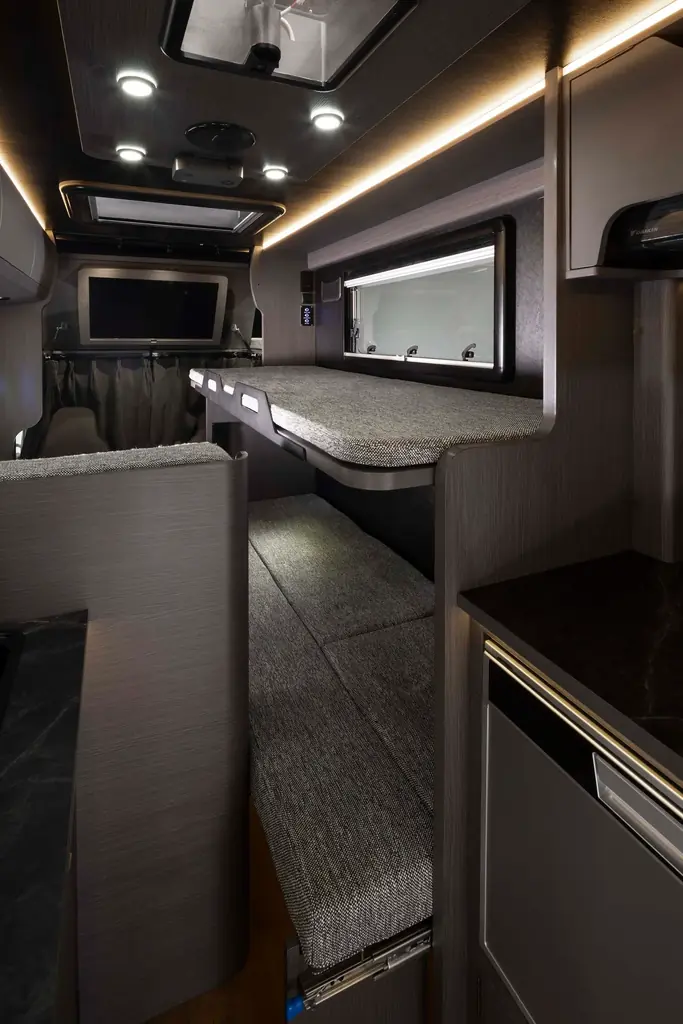 特に注目されるのはリチウムイオンバッテリー400Ahと家庭用エアコンの組み合わせで、外部電源が確保できない環境下でも一定期間の快適性を維持できる点である。また、折り畳み式の2段ベッドは人数や荷物状況に応じた内部空間の使い分けを容易にする。