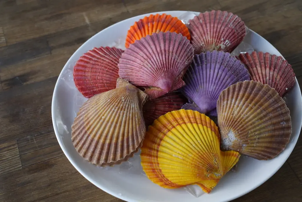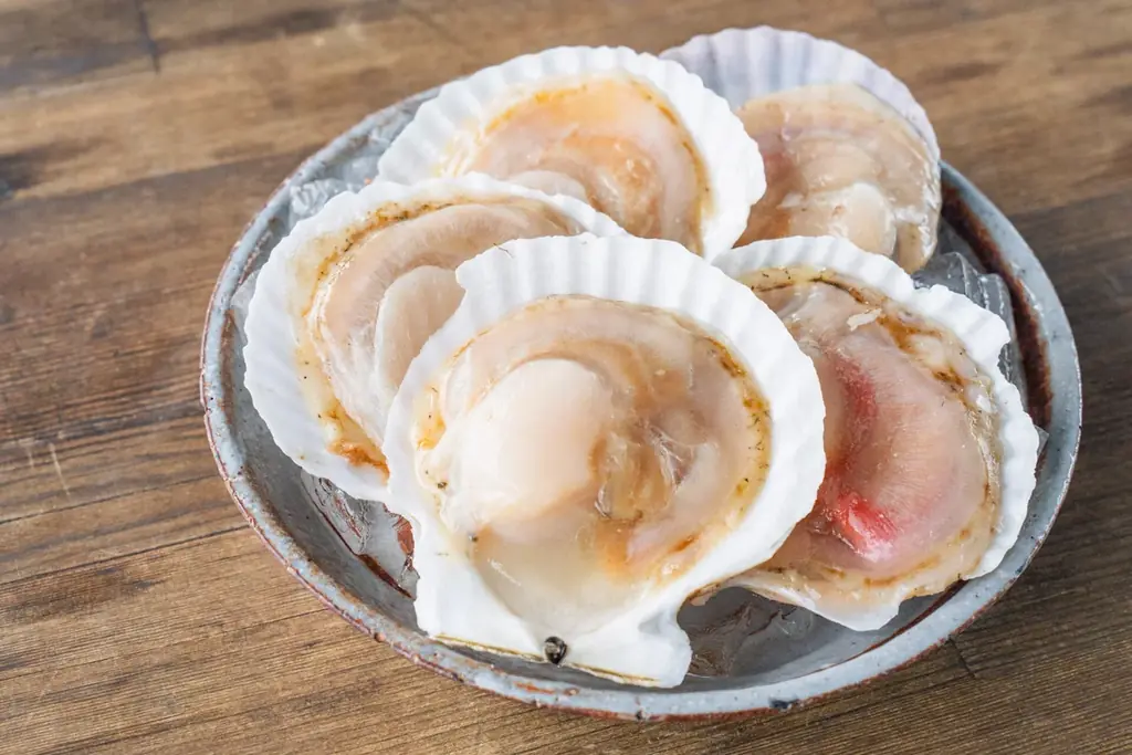海鮮メニューの例としては、緋扇貝、白ハマグリ、ホタテ、海鮮串、干物、イワシ明太などがあり、鮮度の良い貝類や串物が中心です。緋扇貝は「カラフル美味しい」と表現されるように見た目と食感の両面で人気を集める食材です。