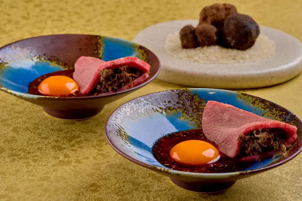 最上級の体験提供としては、特選和牛ヒレを用いた焼きすきメニューにトリュフと濃厚卵黄を組み合わせた一皿を用意するなど、素材と調理法で贅沢を表現する構成を示している。
