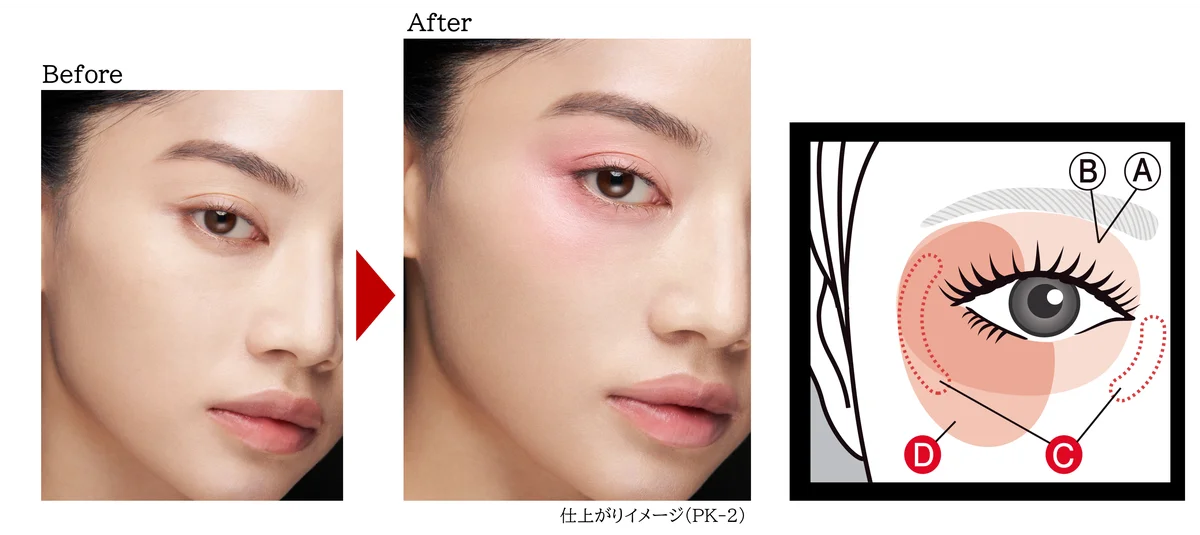 発表資料では「頬までが目もと」と捉える新メイク提案のHOW TOを提示しています。広い範囲に色をのせることで目もとの印象を拡大し、アイメイクとチークの境界をあえて曖昧にすることで自然な立体感を生み出すのが狙いです。