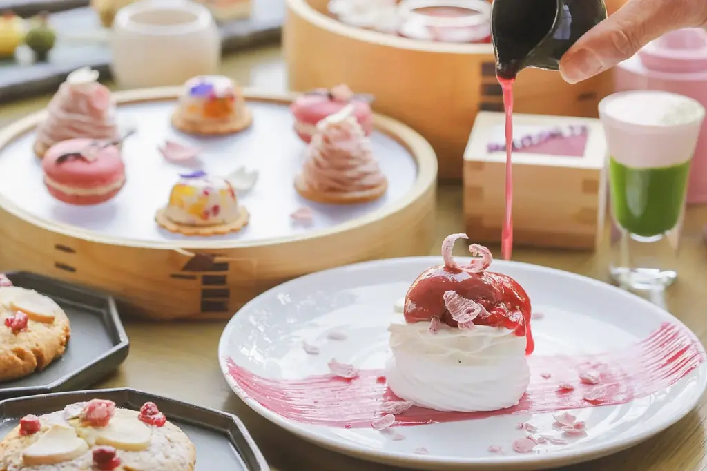 桜のパヴロヴァは、甘酸っぱい桜とベリーで仕上げたソースをたっぷり絡めて味の変化を楽しめる構成になっていると紹介されています。オリジナルモクテルはノンアルコールの独自カクテルで、スイーツとの相性を考慮した3種が提供されます。