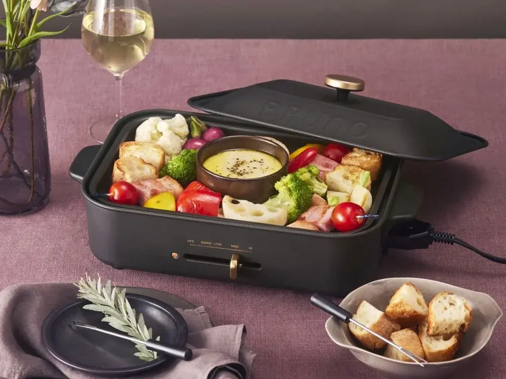 - 彩り野菜のチーズフォンデュ(コンパクトホットプレート使用) — 下準備が手軽でテーブル上で仕上げるパーティーメニュー。