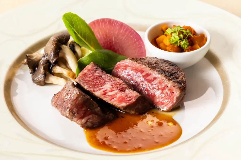 - 国産牛サーロインのグリル 紅くるり大根のコンフィ 西洋わさびソース