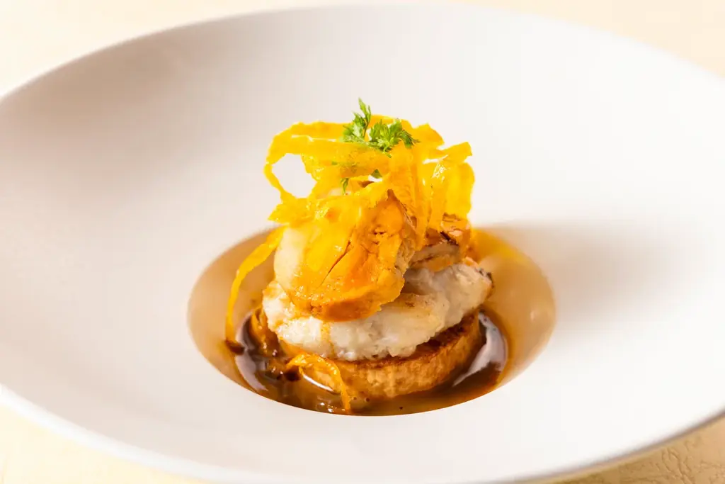 - 鮟鱇・あん肝・自然薯のアンサンブル 鹿児島壺造り黒酢と柚子のバターソース