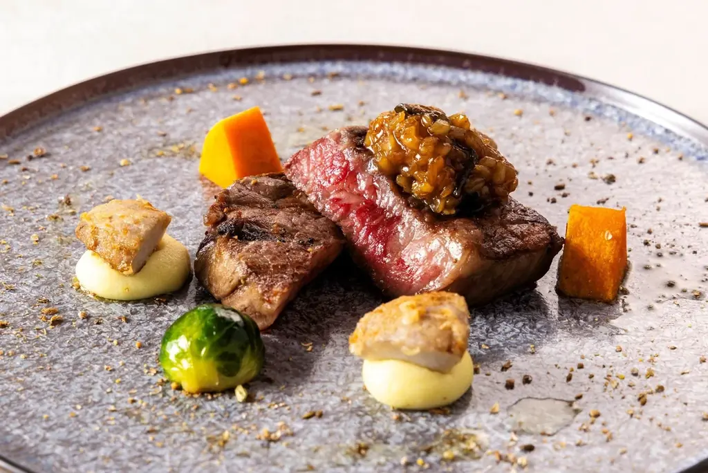 - 黒毛和牛フィレステーキとフォアグラ トリュフ香るマディラワインと大江戸甘味噌のソース