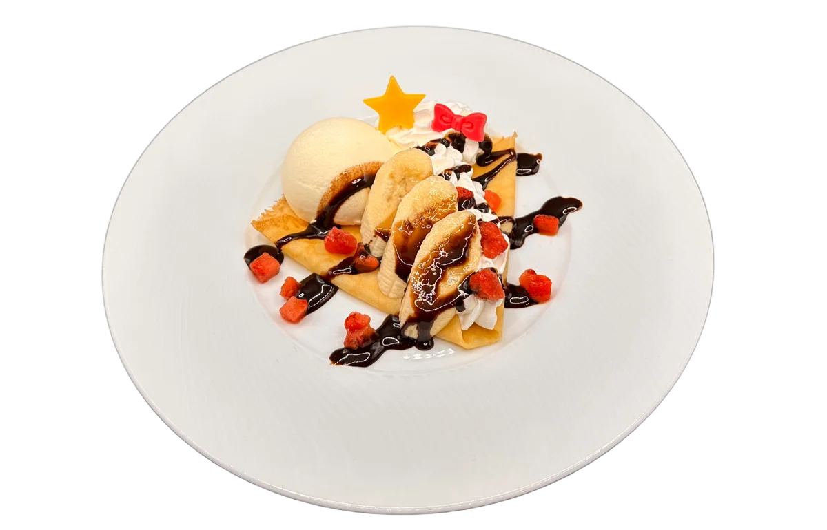 | 文ちゃんと食べたかったミニクレープ | ¥800 | イチゴチョコバナナアイスクレープに「弐乃ちゃんのリボン」「ミヲちゃんの星の髪飾り」チョコをトッピングした一品。 |