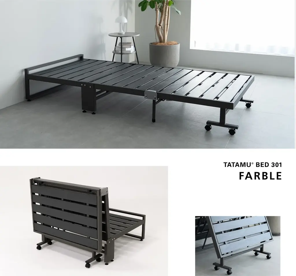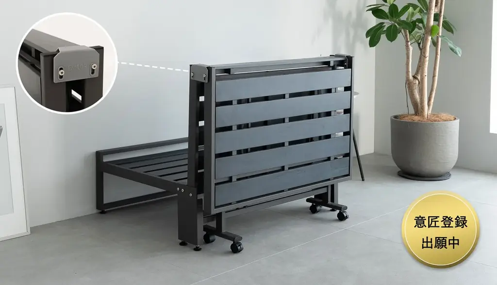 FARBLEはこの思想を具体化した製品として位置づけられ、毎日の折りたたみ操作が負担にならないこと、指を挟みにくい構造などの安全配慮、そして三つ折りマットレスの利点を活かす互換性を兼ね備えています。意匠登録出願中であり、業界内では三つ折りマットレス専用の折りたたみベッドとして初の設計を謳っています。