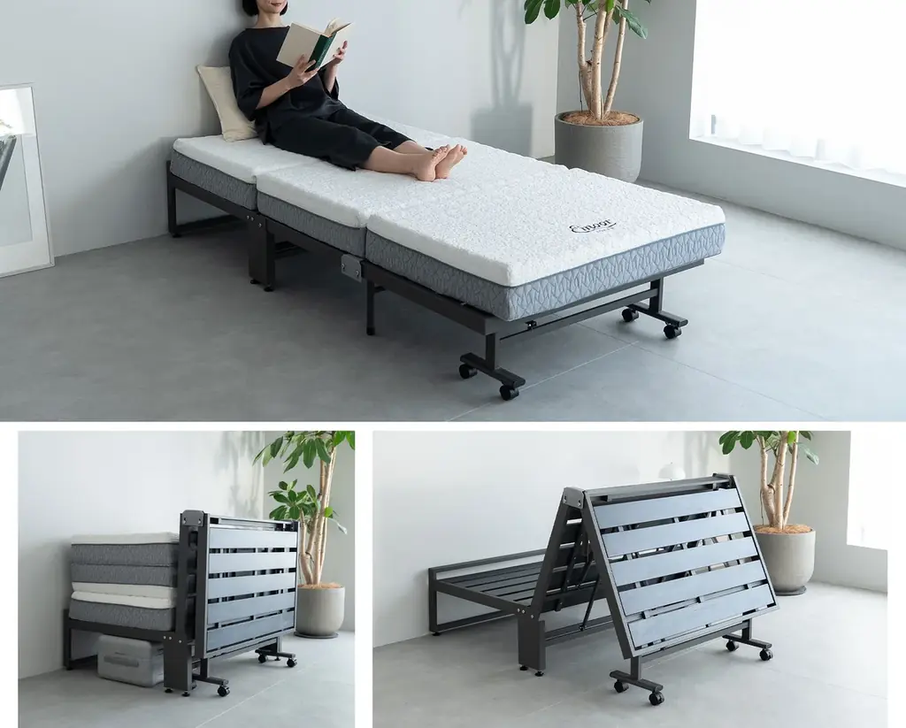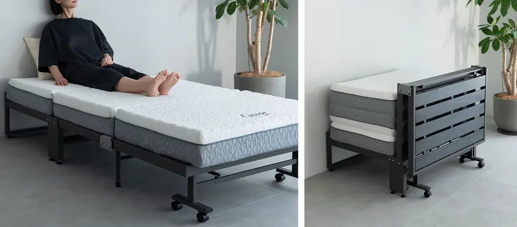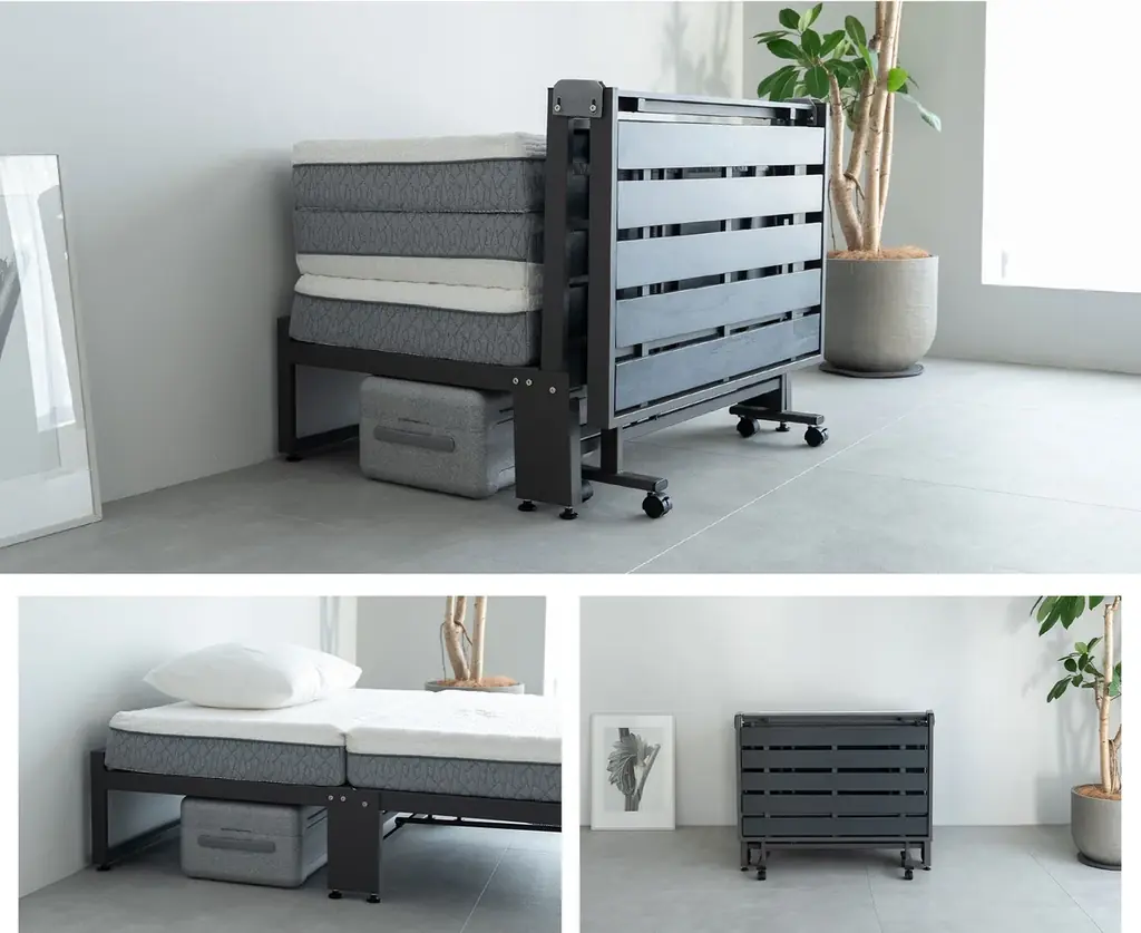 折りたたみ時のデザインは、折りたたんだフレームが低めの間仕切りのように機能し、マットレスや枕を視界から隠すことで生活感を抑えた室内を保てます。ヘッド下には収納スペースも確保され、来客用スペースと寝室を兼用する間取りでの利用に適しています。