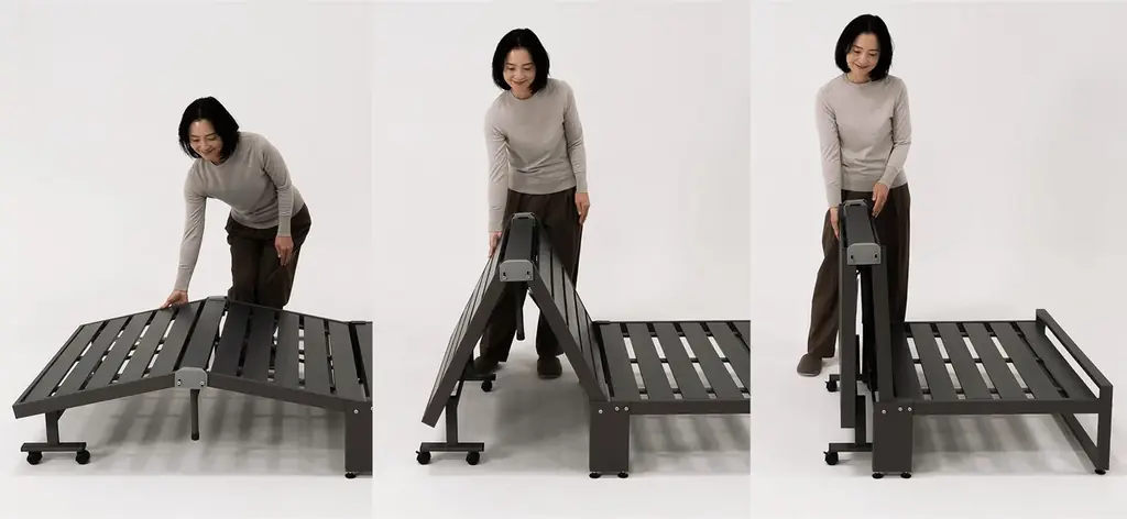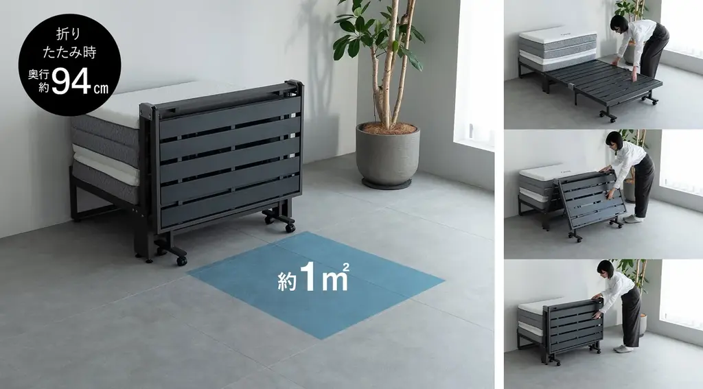 本機はワンルームやリビング兼寝室の限られた空間で、生活感を抑えつつ立ち座りのしやすい高さでのベッド利用と、折りたたむことで生まれる約1平方メートルの余白を両立することを目指して設計されました。三つ折りマットレスの普及が進む市場背景を受け、収納性と見た目を同時に満たす製品です。