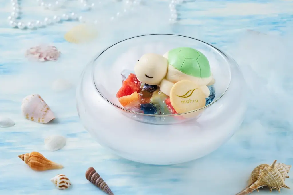 『エメラルドラグーン~幸せを運ぶカメの休息~』は、沖縄・北谷のエメラルドグリーンに輝くラグーンと、そこに現れるウミガメの情景をデザートで表現したものです。透明感のあるジュレ、ホテルメイドのバニラアイス、ゼリーでマリネした旬のフルーツ、そしてオリジナルクッキーが一皿に組み合わさり、見た目の美しさと食感のバランスを追求しています。