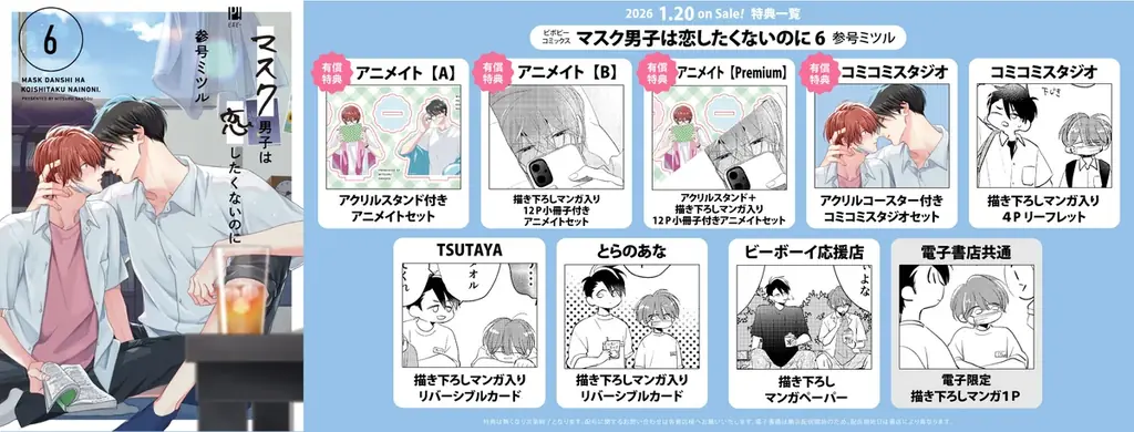 株式会社リブレは、コミックス『マスク男子は恋したくないのに 6』を2026年1月20日に発売すると発表しました。発売日は2026年1月20日、定価は889円(税込)です。電子書籍も同日配信されます。