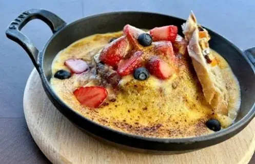 デザートには「レトロフルーツグラタン」を用意しています。苺やブルーベリーなどの果実に栗蜂蜜を組み合わせ、フレンチトースト風に仕立てた上に卵黄を使ったコクのあるサバイヨンクリームをかけてオーブンで香ばしく焼き上げます。