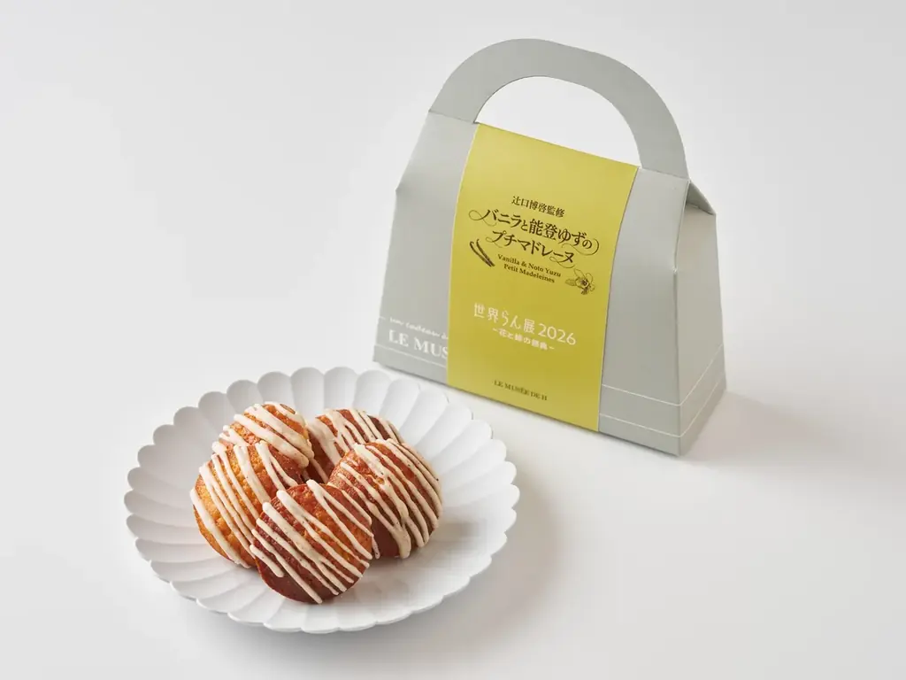 「バニラと能登ゆずのプチマドレーヌ」は、辻口さんの出身地である能登の柚子の果皮を加えることで、バニラの芳醇な甘さに爽やかな柑橘のアクセントをもたらしています。テイクアウト商品として販売され、来場の記念として持ち帰ることができます。
