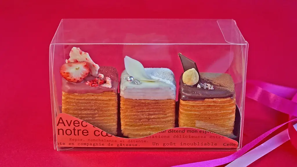 ミニリーヴルはこの技術をミニチュア化したもので、4.5cm角・16層の構成により「めくる楽しみ」を手軽に体験できる仕様になっています。製造は職人による手作業で行われ、素材の香りと層の食感が重視されています。