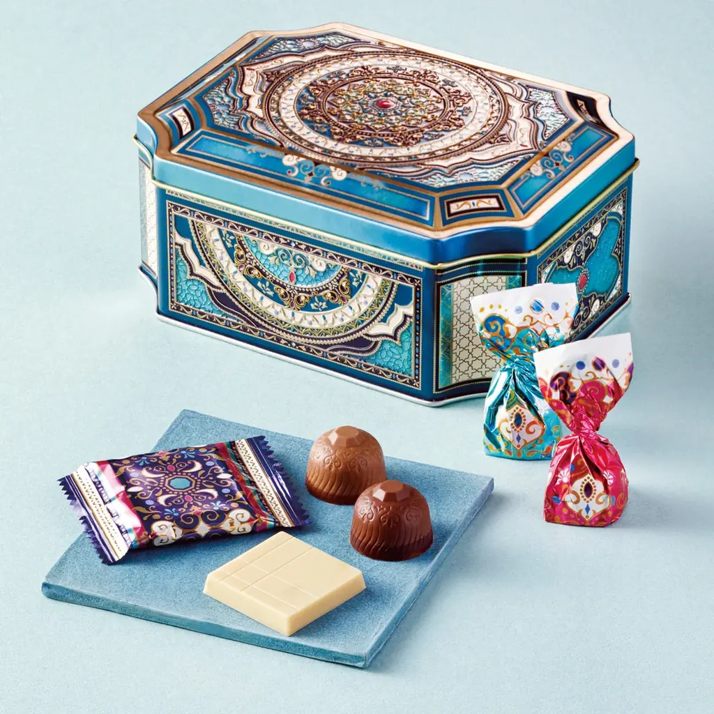 - フルム(夢)15個入り 3,024円。青色パッケージのオリエンタル調の缶に2種類のクリーム入りチョコとピスタチオ味をアソート。