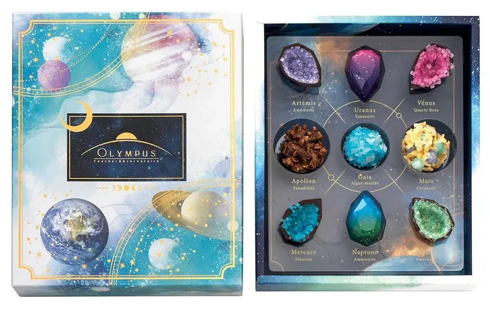- 星の結晶/宇宙鉱物標本 9個入り 2,700円。惑星の鉱物をイメージした煌びやかなショコラ。