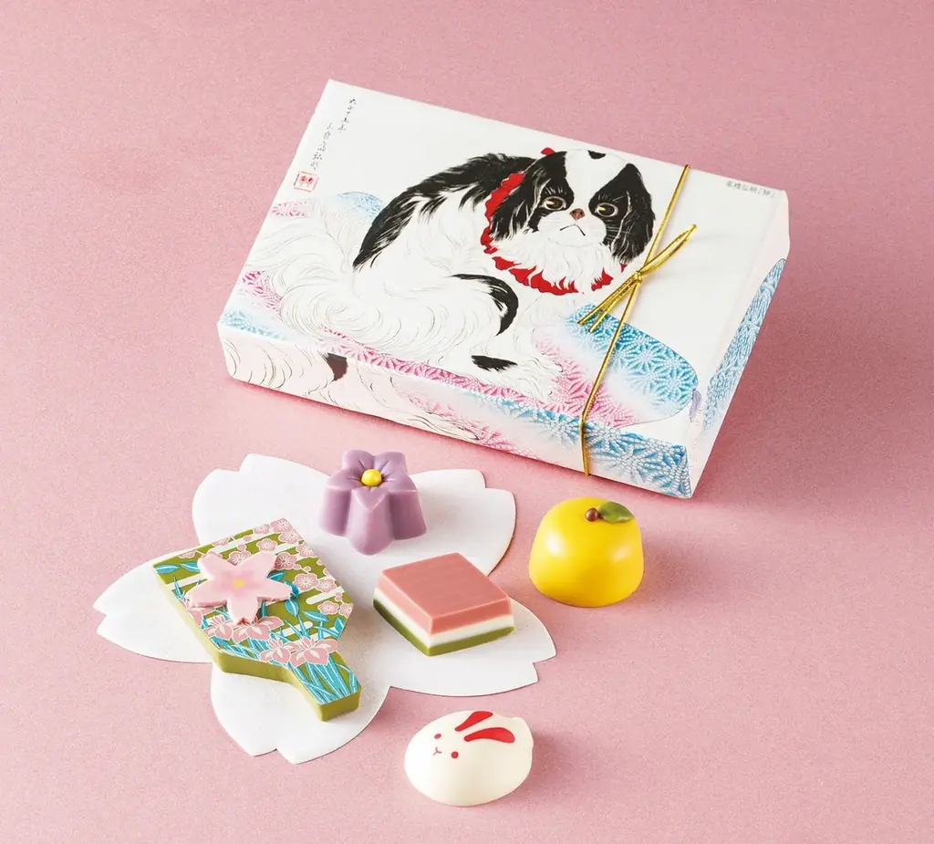 - 甘味画廊 E 5個入り 1,296円。日本画家・高橋弘明の代表作「狆(ちん)」を描いた箱に、抹茶、柚子、紫芋など和の風味を詰め合わせ。