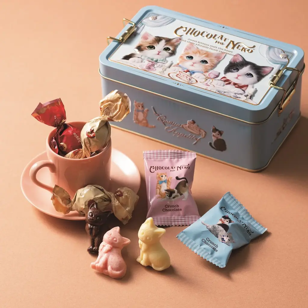 - ショコラな猫 17個入り 1,728円。子猫たちのスイーツパーティーを描いた缶にクランチやトリュフをアソート。