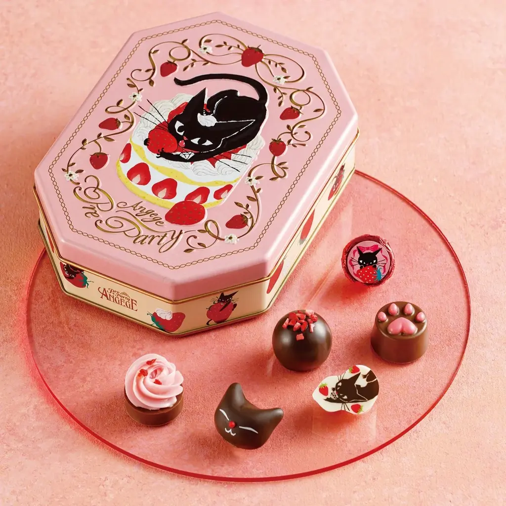 - アンジュジュ F(10個入り)1,296円。黒猫のアンジュジュを描いた缶にあまおういちご味のトリュフ等を詰め合わせ。