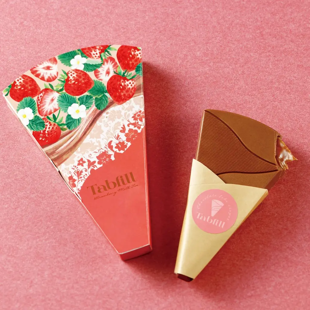 - ストロベリーミルクティー(1個)1,296円。タブレット形のチョコに甘酸っぱいストロベリーソースとミルクティーガナッシュを合わせた商品。
