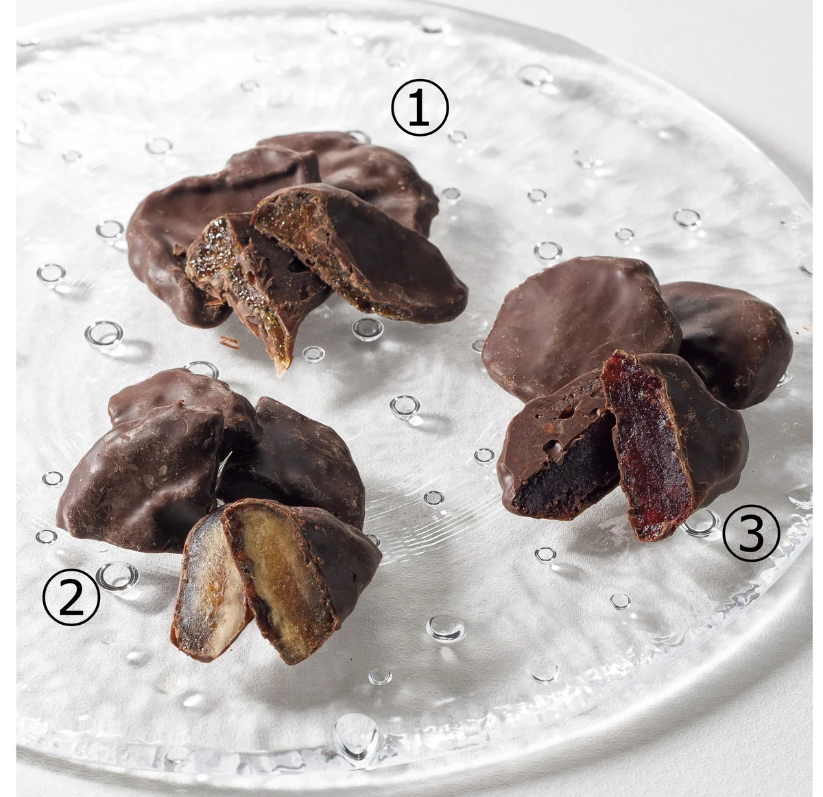 - 不知火フルーツチョコレート(58g)1,242円。ラム香るいちじくチョコレート(60g)1,690円。いちごの王様“あまおう”チョコレート(50g)1,690円。果実をまるごと使ったセミドライフルーツとチョコの組合せ。