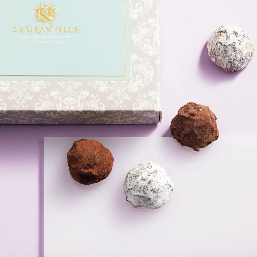 - ベーシックトリュフ(6個入り)1,917円。植物油脂不使用で滑らかな口どけのバタートリュフ(モカ、プラリネ、キャラメルの3種)。