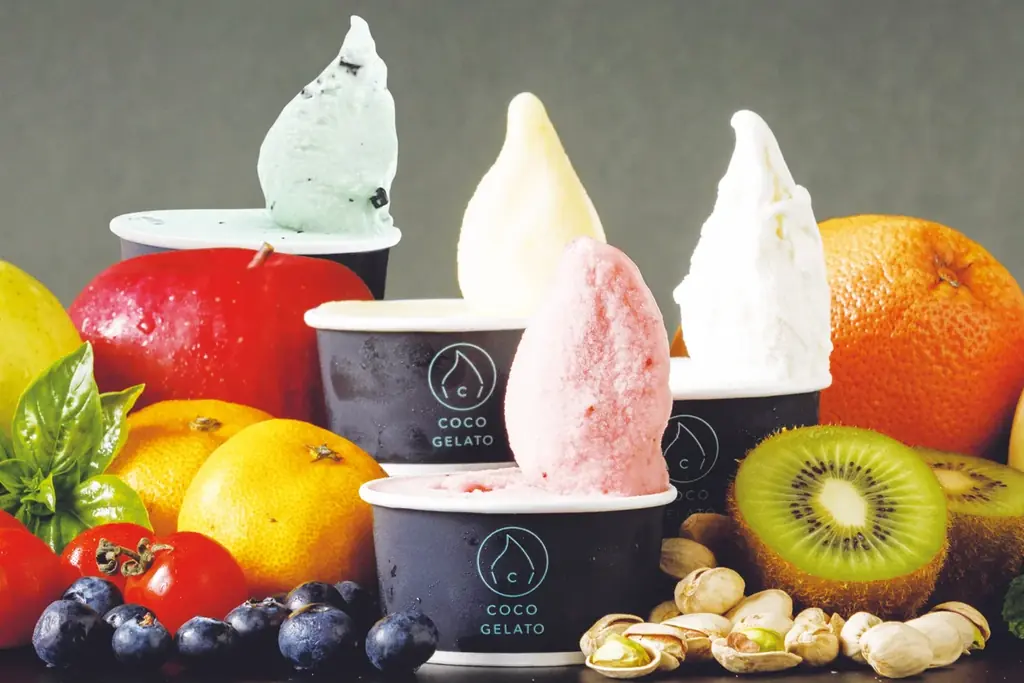 - 〈COCO GELATO〉:ジェラート(シングル)1カップ 660円[イートイン]。糸島あまおう、山梨シャインマスカット、山形ラ・フランスなど、全国のプレミアムフルーツを使用。一部フレーバーは+100円。