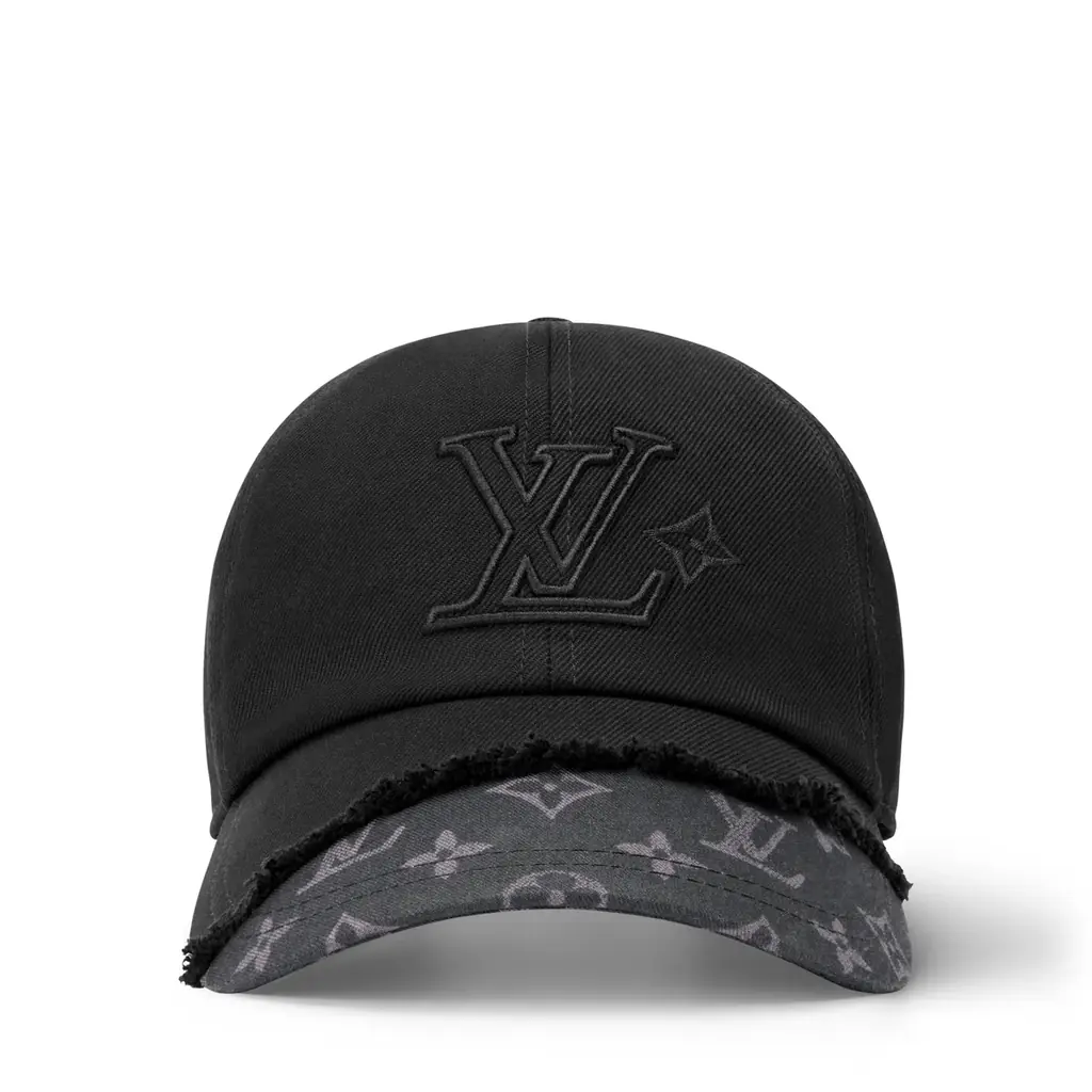キャップ・LV フラワー モノグラムは、スポーティな定番を上品かつエッジィに再解釈した単色のキャップです。ブラックコットンのバイザーをあえてほつれ加工のように仕上げ、その下からモノグラムがのぞくデザインを採用しています。フロントパネル中央には「LV Flower」、バックストラップには「LV Vers」のエンブレムが配されています。