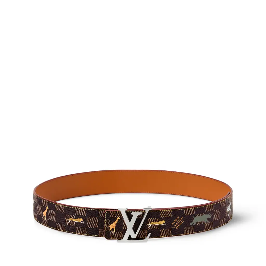 LV × ザ・ダージリン リミテッド ベルト・LV イニシャル 40MM リバーシブルは、ダミエ・パターン面に映画のためにデザインされた動物モチーフを配したリバーシブルベルトです。ストラップはモノグラム・ヘリテージ ダミエ キャンバス、裏面はレザーで構成され、定番モデルを万能に解釈したコレクターズアイテムとして提示されています。