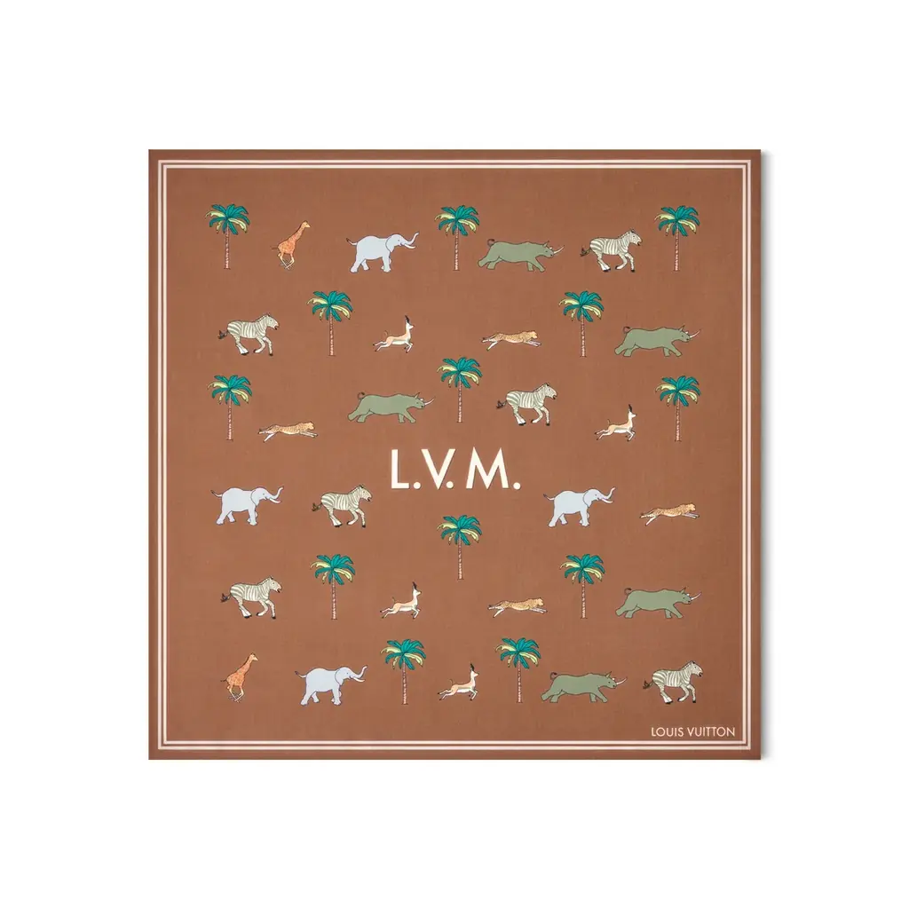 LV × ザ・ダージリン リミテッド バンダナはカシミヤ70%、シルク30%の混紡で、インドのアニマル・パターンを洗練された形で表現しています。サイズはW 55 x H 55 cmで、首元やバッグのアクセントとして用いることが想定されています。