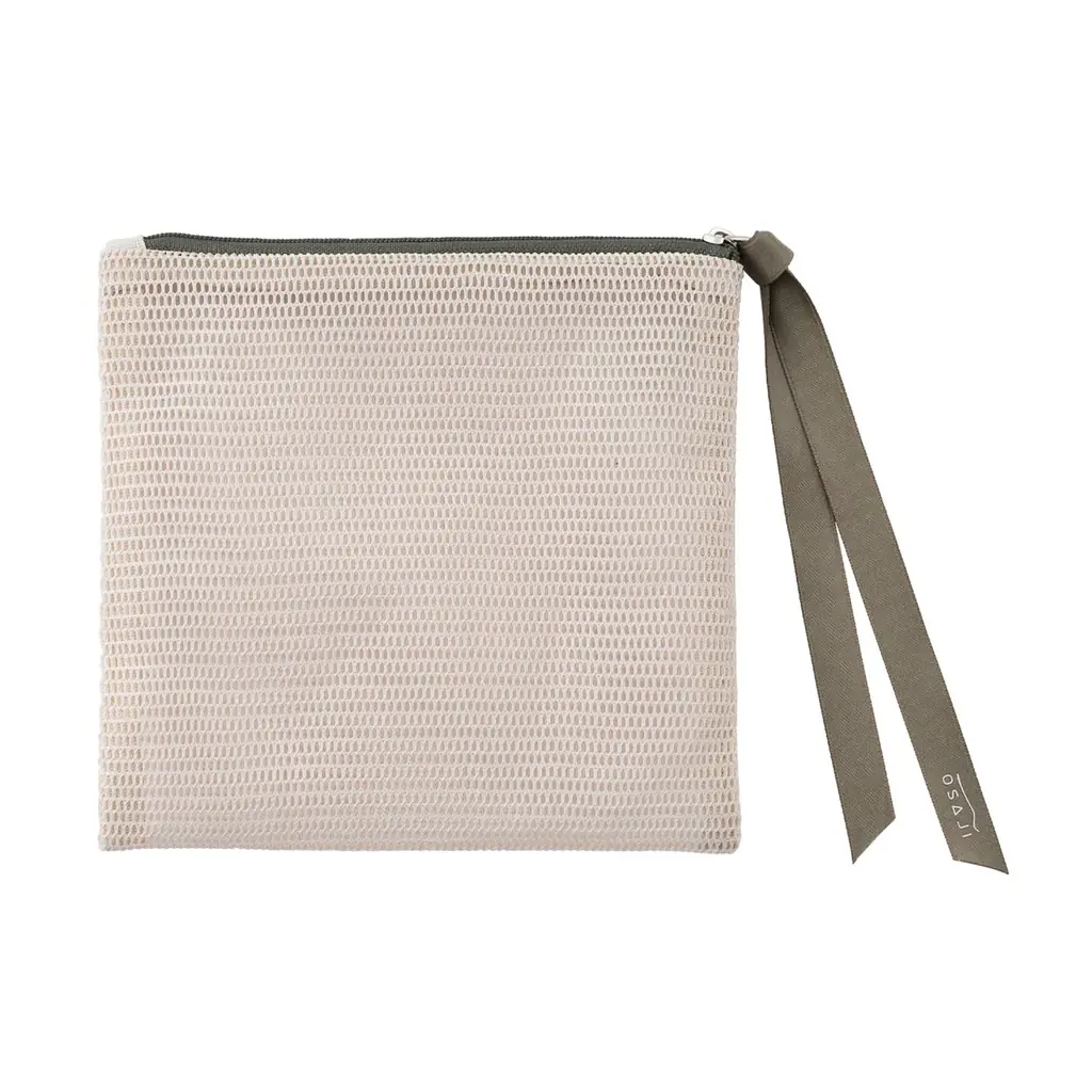 付属のスクエアメッシュポーチは軽やかな透け感のあるメッシュ素材を採用し、OSAJIロゴをあしらったリボンが添えられています。中身がひと目で確認できるため、スキンケアやメイクアップアイテムの整理に便利です。