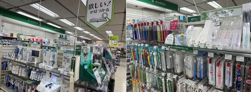 『歯医者さんに褒められるオーラルケア』コーナーでは歯科専売品を中心に歯ブラシのラインナップを強化し、毛の硬さ・形状・ヘッドサイズ・電動/手動といった選択肢を豊富に揃えています。ピンポイント磨き用や極細毛タイプなどユニークな製品も取り扱っています。