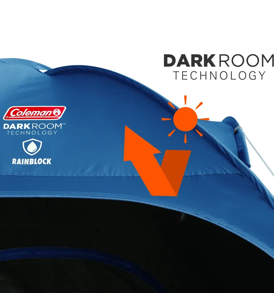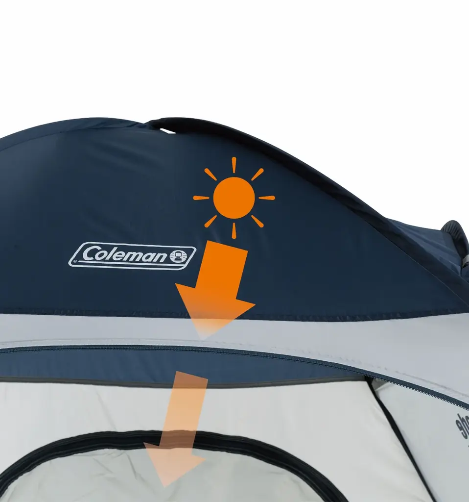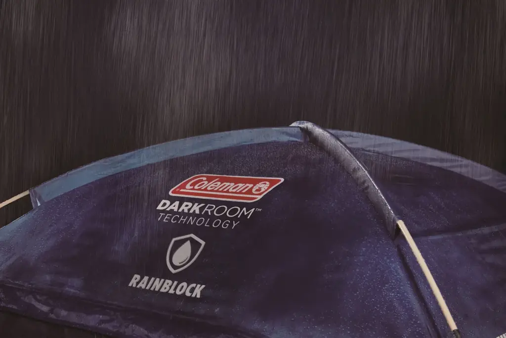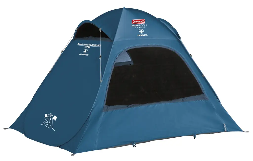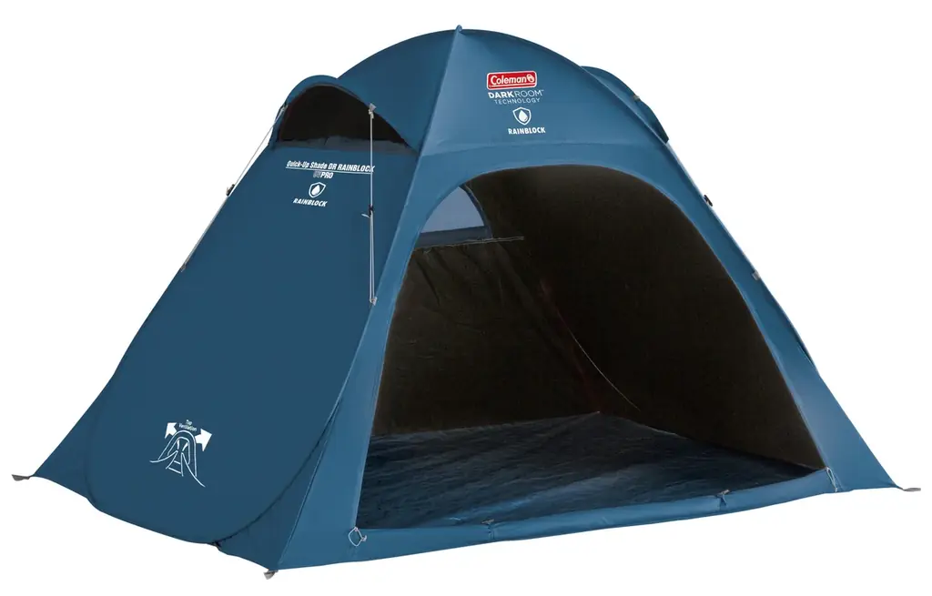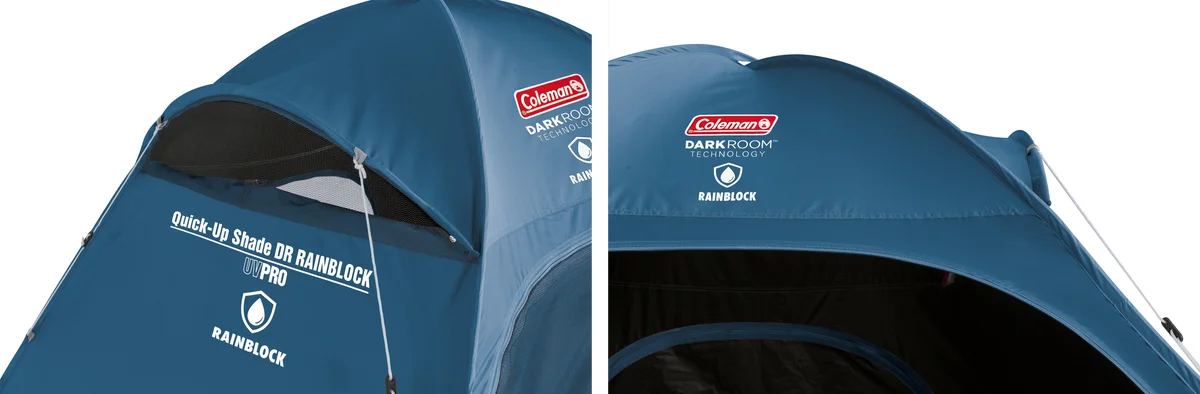 「クイックアップシェードDRレインブロック」は、コールマンの「ダークルームテクノロジー(DR)」を搭載し、紫外線や日光を遮る機能を維持した上で、シェード生地に一時的な雨に対応する簡易防水加工を施しています。これにより、急な小雨でもシェード内の快適性を保ちやすくなっています。