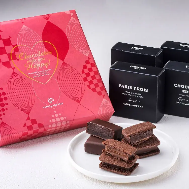 - バニラビーンズ — ショーコラ&パリトロ(4個入):価格 1,987円。ビターフレーバーやミルク、3層の濃厚プチショコラケーキを詰め合わせたバレンタイン限定パッケージ。