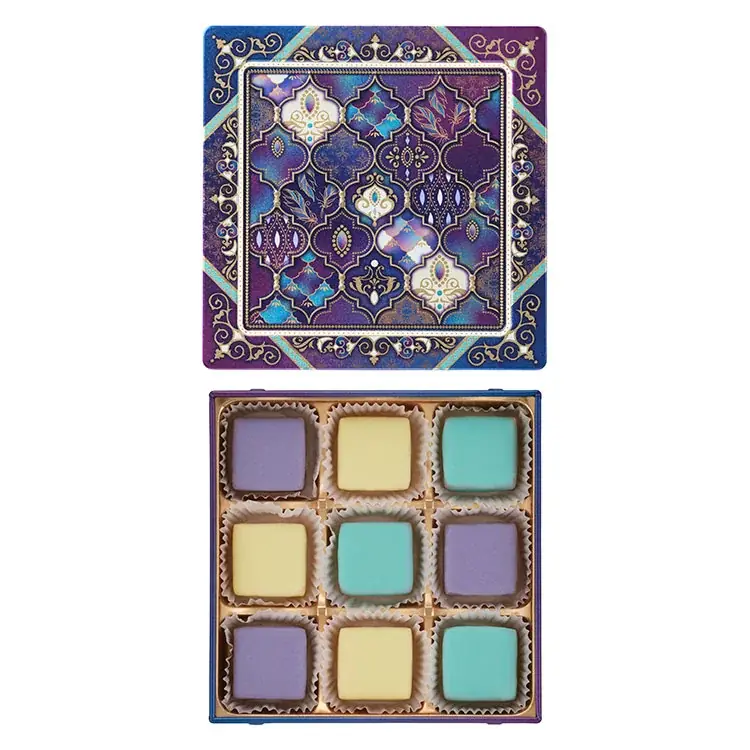 - メリーチョコレート ジャミーラ — アズラクジャミール(9個入):価格 1,728円。”アズラクジャミール”は「美しい青」という意味。タイルをイメージしたチョコレート3種類と煌びやかな缶。