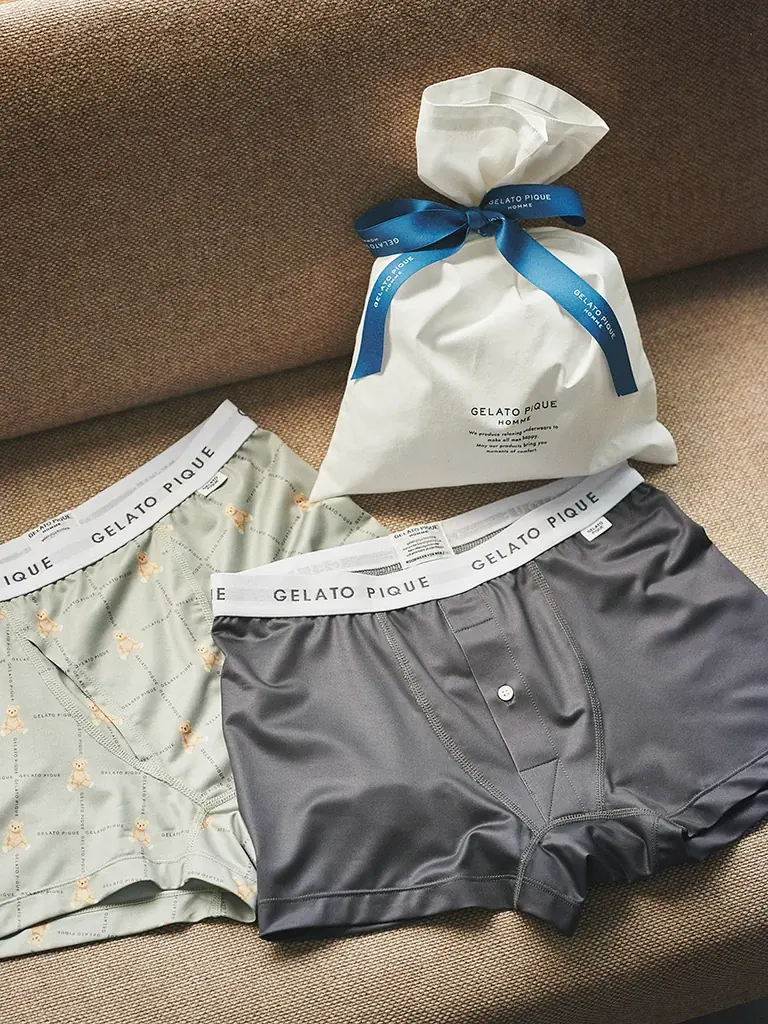 オンラインストアでのみ販売のボクサーパンツ2枚セットは、オリジナルベア柄と無地の組み合わせで、数量限定の商品です。滑らかな肌触りで履き心地が重視されています。
