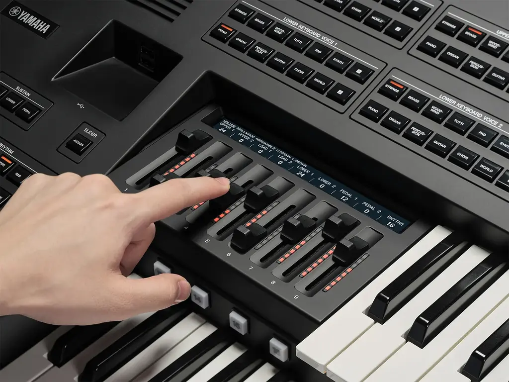 『ELS-03シリーズ』の中心的な新機能の一つが「ライブエクスプレッションコントロール」です。スライダー、エクスプレッションペダル、フットスイッチを組み合わせて音色やリズムを多彩に変化させ、演奏中に繊細なニュアンスから大胆な音の変化までをリアルタイムに表現できます。スライダーは今回初搭載の物理的なつまみを採用しており、9本のスライダーをドローバーとして扱うことでビンテージ・オルガンのような音作りも可能です。