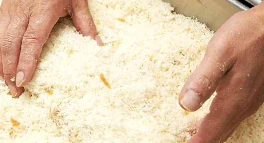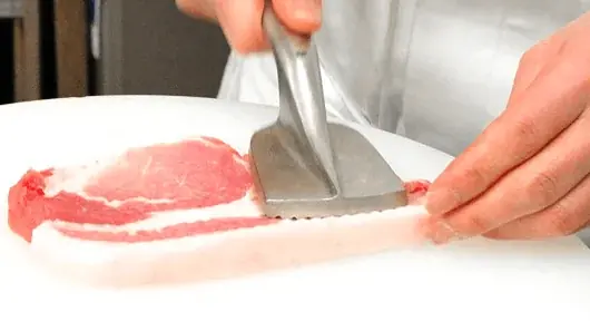 - ・ヒレかつは筋を引き、一枚一枚肉の繊維をほぐす作業を行います。1本の筋の切り損ないがあると揚げたときに肉の形が崩れるため、手間のかかる工程ですがここは手抜きが許されない工程です。