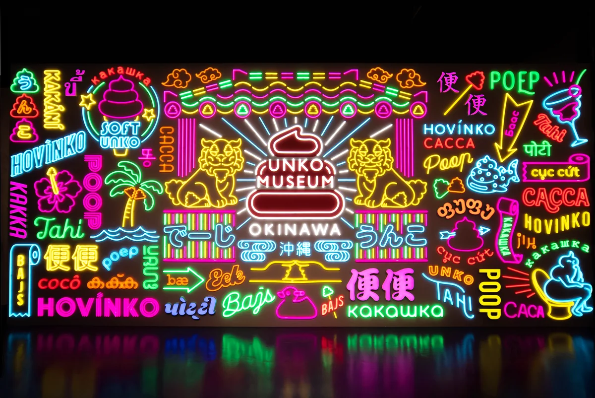 さまざまな言語で「うんこ」がネオンサインになった人気のフォトスポット。ポーズや構図を工夫して写真撮影を楽しめます。
