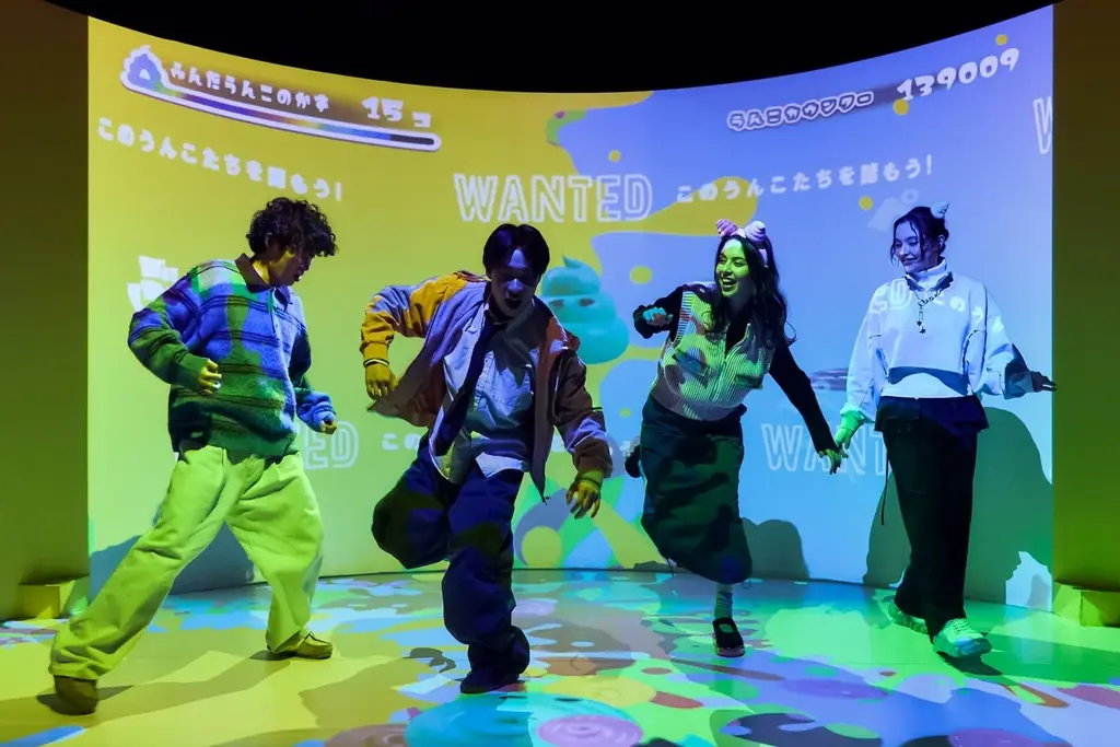 地面に映し出されたカラフルなうんこを追いかけて踏む体験型コンテンツです。童心に帰って楽しめる構成です。