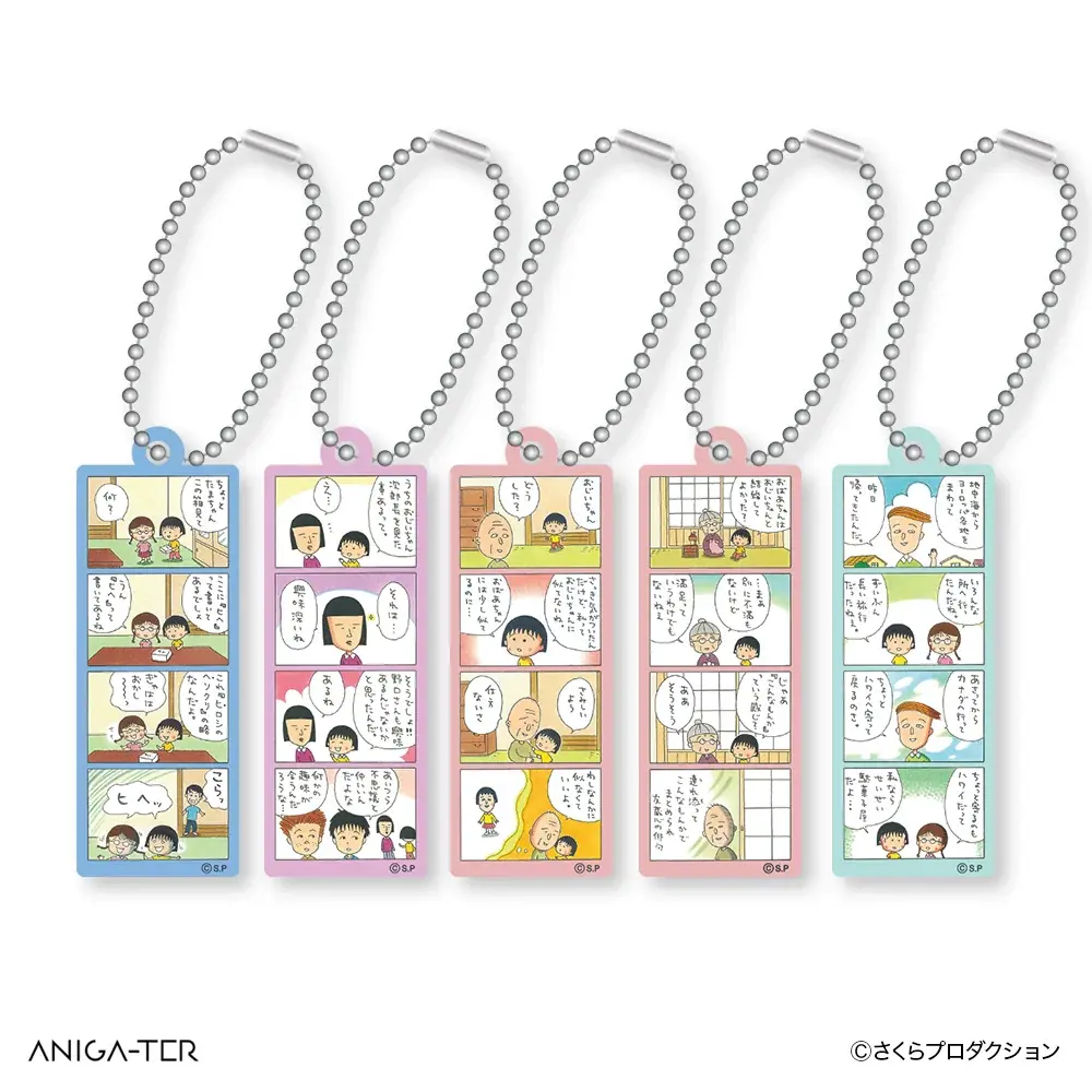 さくらももこさんによる4コマ漫画のワンシーンを用いたミニアクリルキーホルダーです。全5種のうち1種がランダムで封入されます。