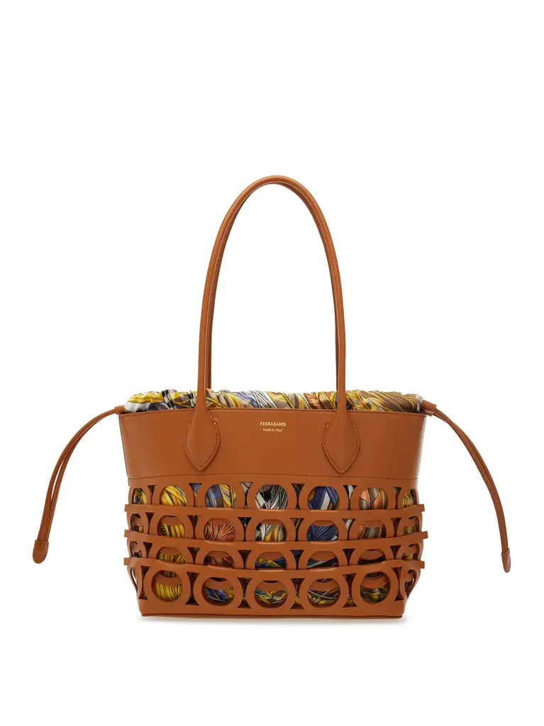 フェラガモが今回提示する主題は、形と象徴性による“抱擁”と“生命力”の表現である。阪急うめだ本店でフィーチャーされる「HUG」バッグは、両サイドに抱きかかえるように配置されたガンチーニクロージャーが最大の特徴で、視覚的にも機能的にも“抱く”というイメージを提示する。