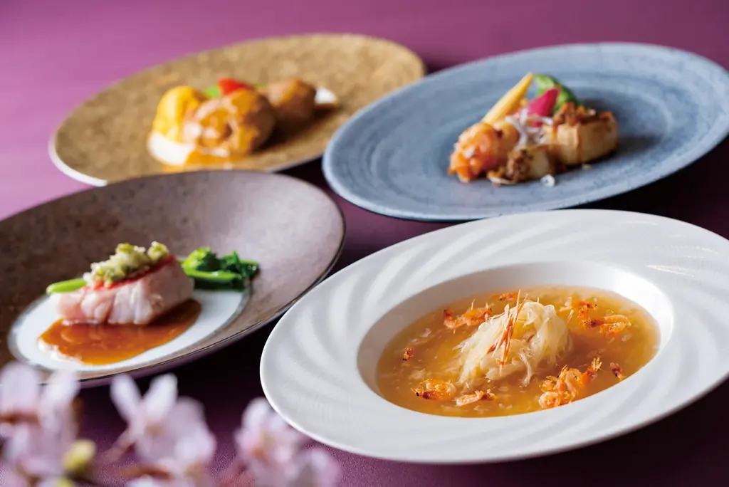 ランチコース「桜」は、ふかひれやハマグリなど滋味深い食材を用いた品目が並びます。味や食感の異なる料理を組み合わせて、春の食材を存分に楽しめる内容です。
