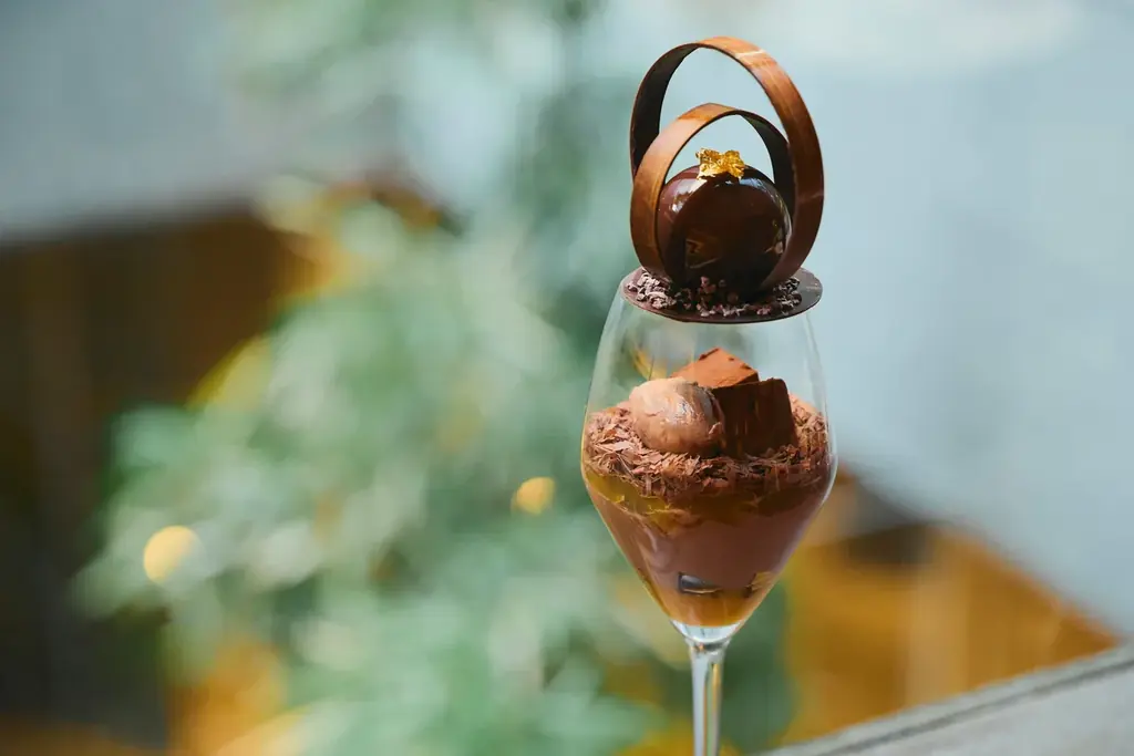 パフェは複数の素材が層を成しており、それぞれが異なる食感と風味をもたらします。香ばしいくるみ入りのブラウニーが土台となり、滑らかなチョコレートクリームが重なります。そこに柑橘ジュレが加わることで、ショコラの濃厚さに甘酸っぱい爽やかさが差し込まれます。