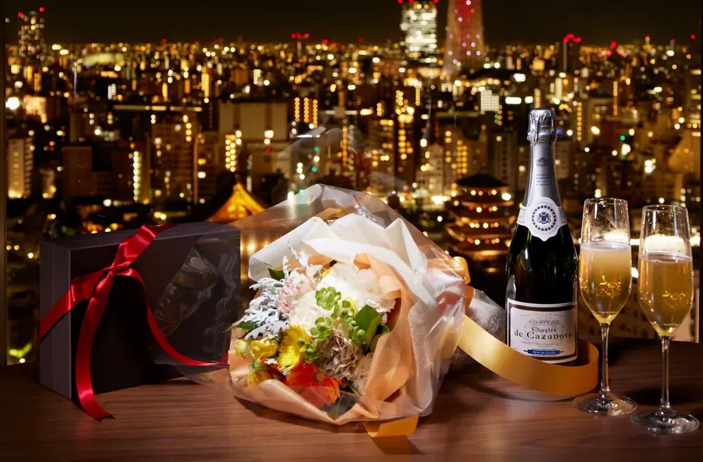 | イブニングハイティー 記念日プラン | 28階 THE TOP BAR Hanabi -華美- | プレミアムBOXシート:オープン記念価格 ¥37,000(通常 ¥42,000) ペアシート:オープン記念価格 ¥32,000(通常 ¥37,000) | 2名でボトルシャンパン1本(ノンアル可)、イブニングハイティー、国産牛フィレ肉のポワレ(トリュフソース)、マロンショコラとラム香るモンブラン風スイーツ(お一人様1皿)、ホテルメイドいちごショートケーキ(4号、持ち帰り可)、カフェ | 17:00〜23:00(LO フード22:00/ドリンク22:30) | 事前予約(来店2日前まで)/WEB予約または電話 03-3842-2124(10:00〜17:00) |