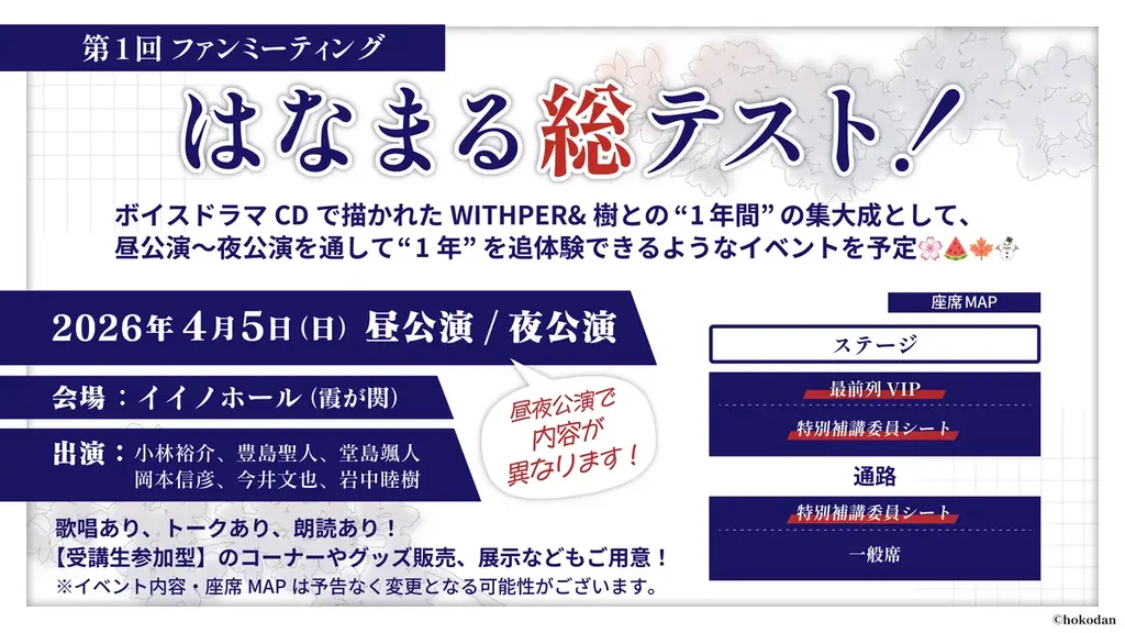 | イベント | 補講男子 第1回ファンミーティング~はなまる総テスト!~ 日時:2026年4月5日(昼14:00 / 夜18:30) 会場:イイノホール(東京・霞が関) 出演:小林裕介、豊島聖人、堂島颯人、岡本信彦、今井文也、岩中睦樹 |