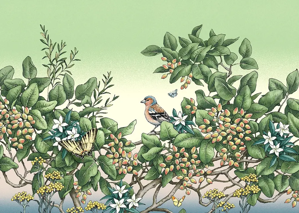 新商品のパッケージデザインはイラストレーター河合真維氏に依頼されています。モチーフはシチリア、エトナ山の麓に生育するピスタチオの木で、シチリア由来の動植物を配した華やかな描写が特徴です。