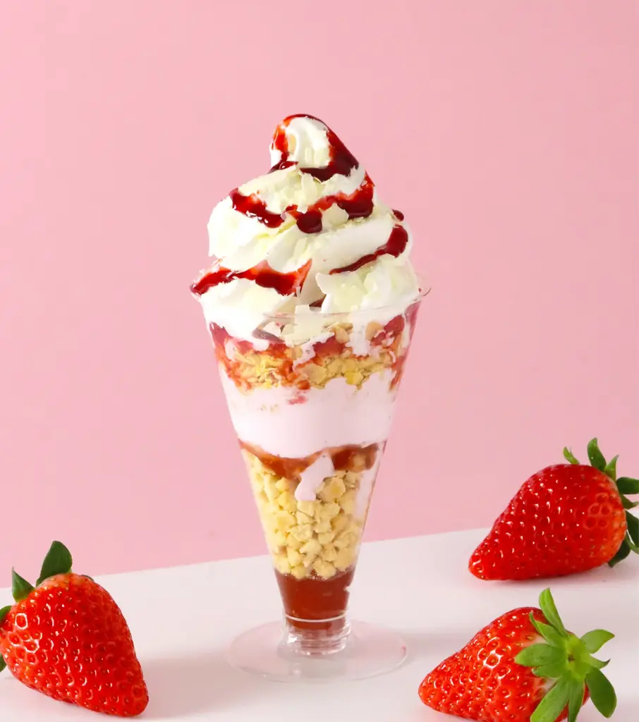 - 特徴:静岡県産いちごジャム、あさぎり牛乳いちごソフトとミルクソフトを重ね、バタークッキーやコーンフレーク、ホワイトチョコをトッピング。コクと甘酸っぱさ、食感のアクセントが重なり合う贅沢なパフェ。