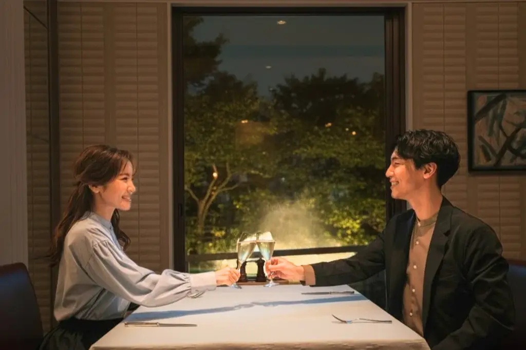 当日の流れは、ホテル館内のオールデイダイニング「SATSUKI」または鉄板焼「欅」でのディナーから始まります。乾杯ドリンク付きのディナーが先に用意され、食事の余韻が自然に緊張をほどきます。